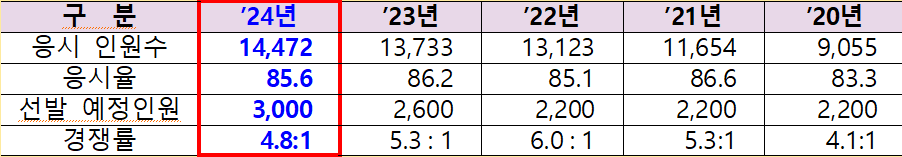 올해 선발 예정인원은 3,000명으로 작년(2,600명)보다 400명 증가함에 따라 경쟁률은 4.8대 1로, 지난해 5.3대 1보다 하락했다.(0.5:1↓)