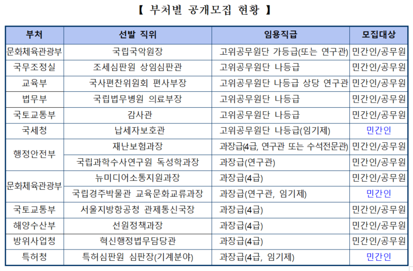 공모 대상은 고위공무원단 6개 직위와 과장급 8개 직위다. 고위공무원단 직위는 ▲문화체육관광부 국립국악원장 ▲국무조정실 조세심판원 상임심판관 ▲교육부 국사편찬위원회 편사부장 ▲법무부 국립법무병원 의료부장 ▲국토교통부 감사관 ▲국세청 납세자보호관 등 6개이다.