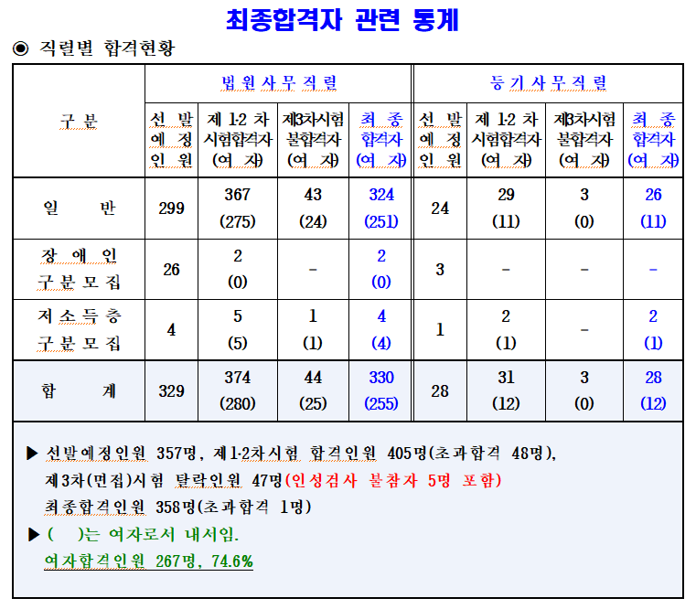 법원행정처는 올해 법원직 9급 법원·등기사무직렬 필기시험 합격자 405명을 대상으로 인·적성검사(7월 16일)와 제3차 면접시험(7. 31. 일반면접/8. 1. 심층면접)까지 시행한 후 358명(법원사무 330명, 등기사무 28명)을 최종합격자로 결정했다.