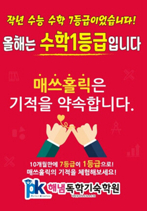 피케이해냄독학기숙학원은 수학의 경우 매스홀릭 프로그램을 활용하고 있다. 매쓰홀릭 프로그램은 틀린 문제나 유사문항 등을 반복학습 시키고, 수험생이 교과과정을 얼마나 이해하고 있는지 정확하게 진단하고 최적의 경로를 알려준다. 이후 수학 담당 교사는 학생별로 개인별 피드백을 통해 완전학습이 이루어 질 수 있도록 도와준다.