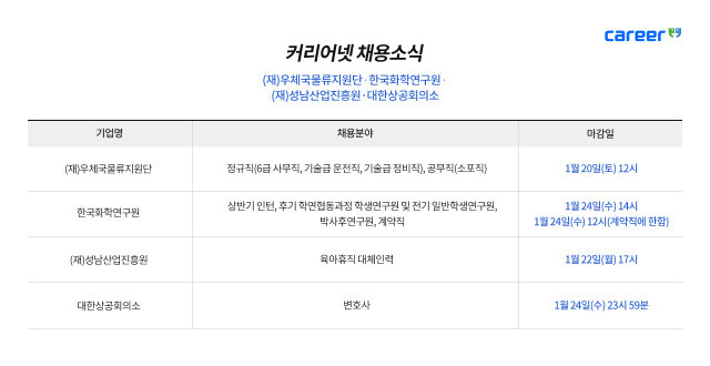 [피앤피뉴스=이수진 기자] 커리어넷이 우체국물류지원단, 한국화학연구원, 성남산업진흥원, 대한상공회의소 등의 채용 소식을 발표했다.