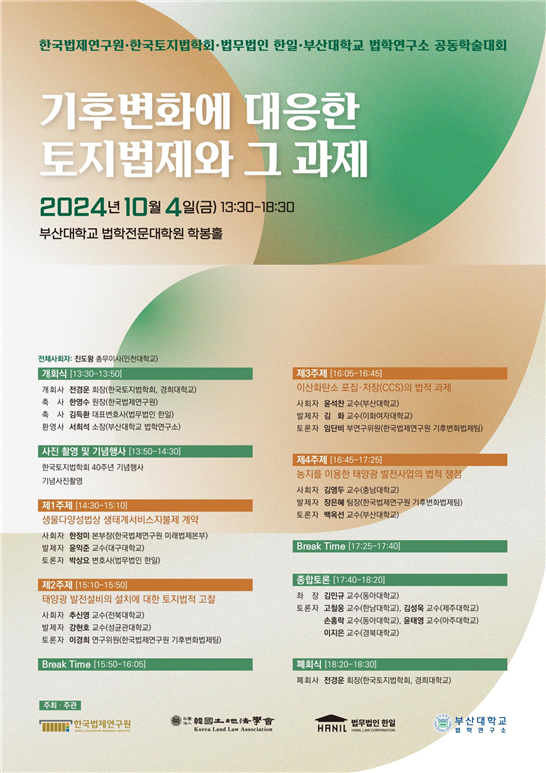 [피앤피뉴스=서광석 기자] 한국법제연구원은 4일 부산대 법전원 학봉홀에서 ‘기후변화에 대응한 토지법제와 그 과제’를 주제로 한국토지법학회, 법무법인 한일, 부산대 법학연구소와 공동 학술대회를 개최했다.