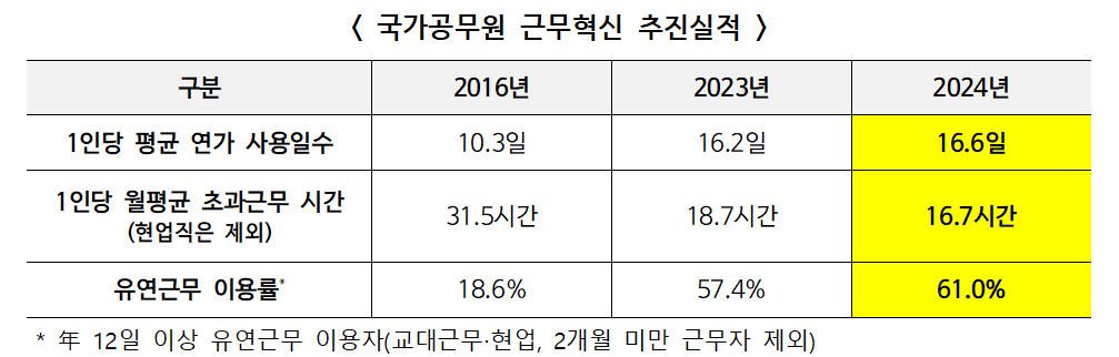 인사혁신처는 23일 ‘2024년 국가공무원 근무 혁신 추진실적’ 점검 결과를 발표하며, 유연근무 확산과 연가 활성화, 초과근무 감축 등 공무원 업무 방식의 혁신적 변화가 뚜렷하게 나타나고 있다고 밝혔다.
