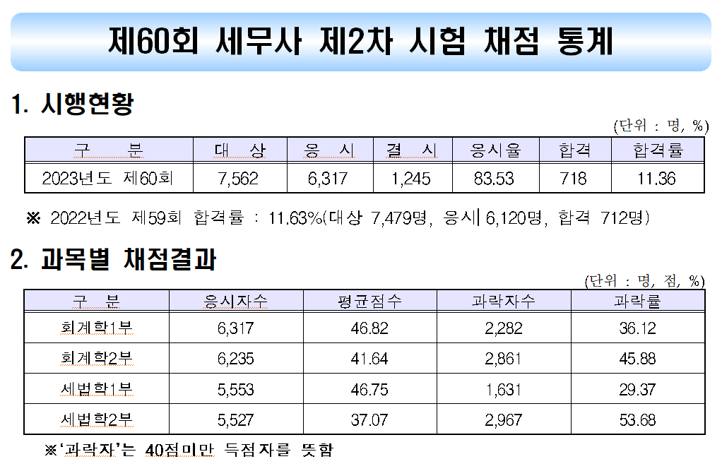 한편, 지난해 제60회 세무사 2차 시험에는 응시자 6,317명 중 718명이 합격했으며, 11.36%의 합격률을 기록했다. 또한 합격 커트라인(최소득점)은 평균 59.75점이었다.