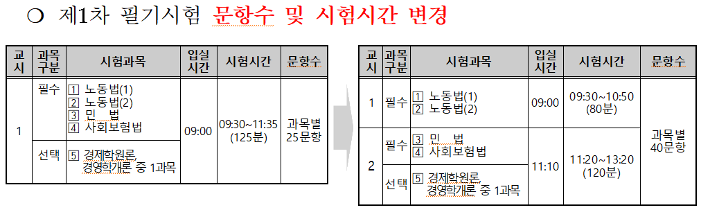 또 1차 시험부터는 문항 수와 시험시간이 변경된다. 과목별 문항 수가 40문항으로 늘어나고, 시험시간도 1교시 80분, 2교시 120분 등 총 200분 시험을 치른다.