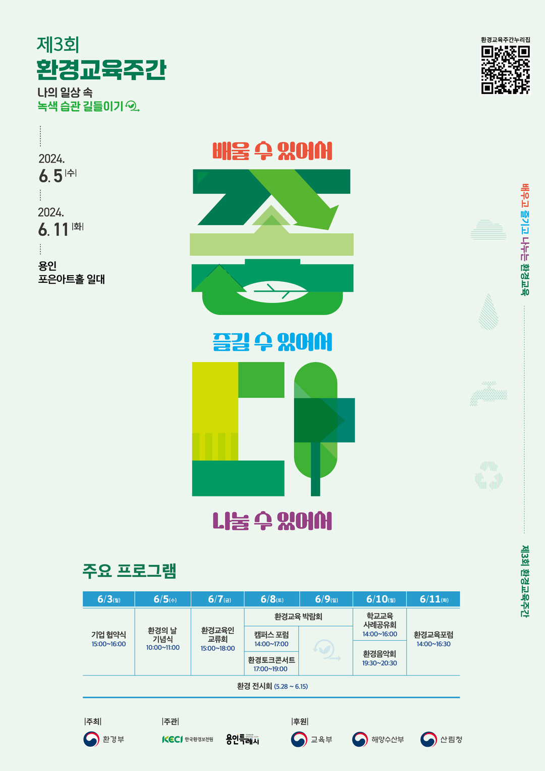 환경부(장관 한화진)와 한국환경보전원(원장 신진수)은 '2024년 제3회 환경교육주간'을 맞아 6월 11일까지 경기도 용인 포은아트홀 일대에서 '나의 일상 속 녹색 습관 길들이기'를 주제로 환경교육의 중요성을 알리고 녹색생활을 실천할 수 있는 다양한 행사를 진행한다고 밝혔다.