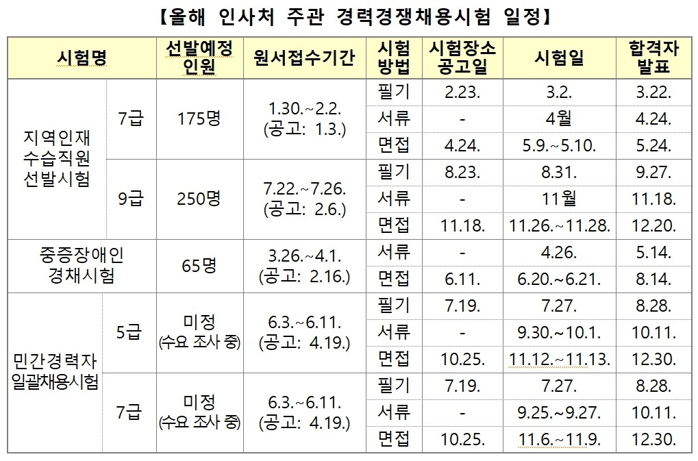 김성연 인재채용국장은 “수험생들에게 연간 시험 일정 계획을 미리 알림으로써 시험을 준비하는데 편의성을 좀 더 높였다”며 “국민에 헌신하고 열정적으로 일할 우수 인재가 많이 지원하기를 바란다”고 전했다.