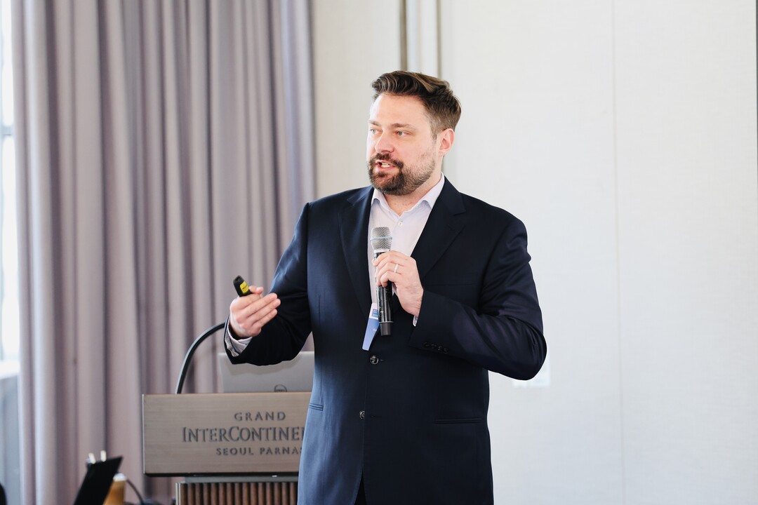 ▲캘럽 스나이더(Caleb Snider), 아시아 사장(Managing Director, Asia)이 서울 살롱에서 오픈 엑세스에 대해서 발표하고 있다. (사진=엠디피아이코리아 제공)