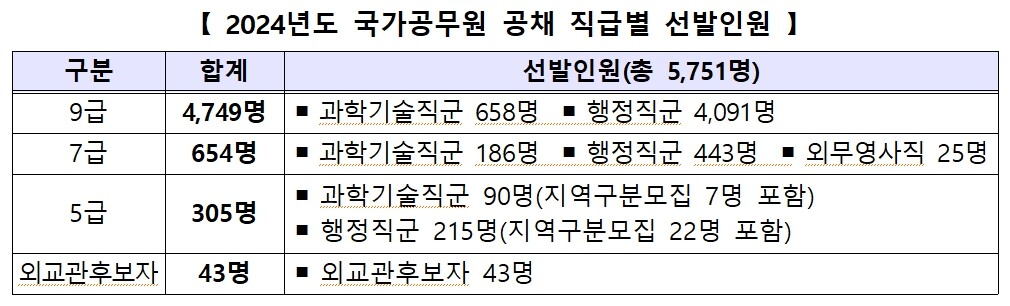 인사혁신처는 내년도 선발인원 9급 공채 4,749명, 7급 공채 654명, 5급 공채 305명 등으로, 정년퇴직 인원 감소, 정부 인력운영 효율화 기조 등을 고려해 결정했다고 28일 밝혔다.