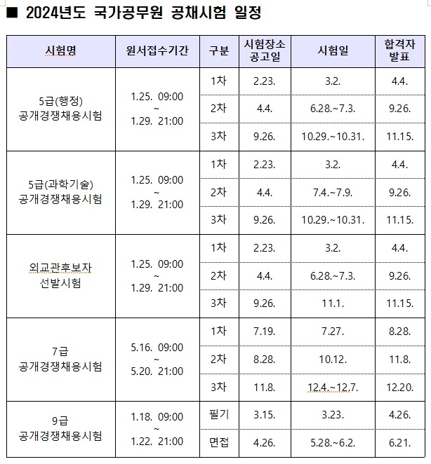 한편, 내년부터 달라지는 시험제도, 시험별‧직렬별 응시 자격, 시험과목 등을 포함한 ‘2024년도 국가공무원 공개경쟁채용시험 등 계획’은 사이버국가고시센터를 통해 내년 1월 초 공고될 예정이다.