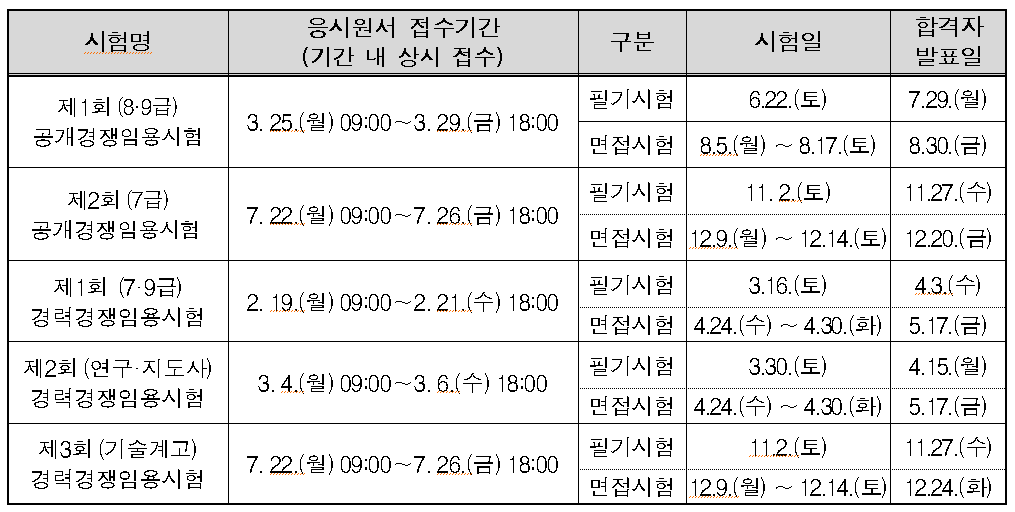 제1회 8·9급 공개경쟁 임용시험(2,393명)의 응시원서 접수는 3월 25일(월)부터 29일(금)까지 진행되며, 필기시험을 6월 22일(토) 시행하여 합격자를 7월 29일(월) 발표한다. 면접시험을 8월 5일(월)부터 17일(토)까지 실시한 후 최종합격자를 8월 30일(금) 확정한다.