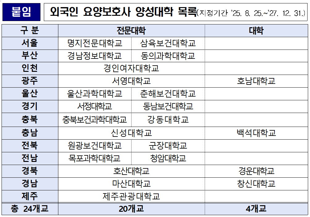 [피앤피뉴스=마성배 기자] 법무부와 보건복지부가 국내 돌봄 인력난 해소를 위해 외국인 유학생을 대상으로 요양보호사를 체계적으로 양성할 ‘외국인 요양보호사 양성대학’ 24곳을 최종 확정했다.