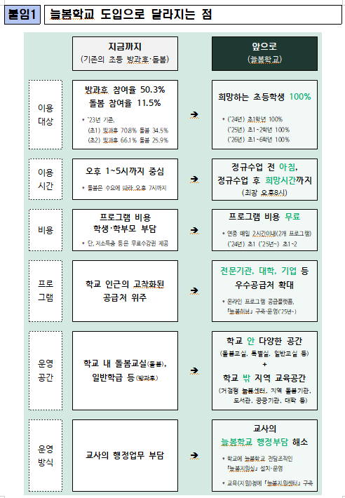 기존의 초등학교 방과후·돌봄 체제에서는 돌봄교실 신청에 우선순위가 있었으나, 늘봄학교에서는 신청 우선순위, 추첨, 탈락 등이 없고 맞벌이 가정 여부도 상관없다.