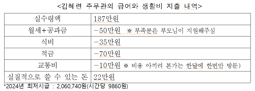 지난해 공무원 시험에 합격해 농림축산식품부 지방관서에 첫 발령을 받은 김혜련(가명) 주무관은 자신의 급여명세서와 생활비 내역을 공개하며, “부모님께서 월세 내는데 보태라고 매달 돈을 보내주시는데, 공무원이라는 자부심을 전혀 느낄 수 없는 게 현실”이라며, “국가직 공무원 월급이 이렇게 적고 다른 지원이 없는 걸 알았다면 차라리 집에서 출퇴근할 수 있는 지방직 시험을 봤을 것”이라며 아쉬움을 토로했다.