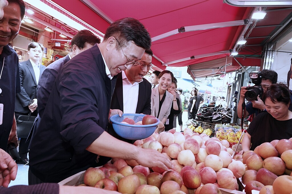 ▲윤호중 행정안전부 장관이 지난 7월 24일 오후 서울 금천구 비단길 현대시장을 방문하여 민생회복 소비쿠폰 사용가능 매장 스티커를 부착하며 상인들을 격려하고 있다.(행정안전부 제공) |