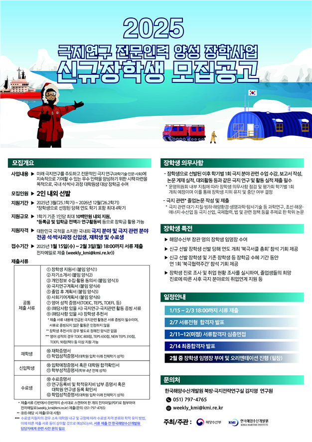 장학생 지원을 희망하는 대학원생은 해양수산부 누리집의 공고문을 참고해 모집 기간 내 전자우편(weekly_kmi@kmi.re.kr)으로 지원서와 필요한 서류를 제출하면 된다. 이후 서류심사와 심층면접을 거쳐 최종 2명이 선발되며, 결과는 2월 14일 해양수산부 누리집에 공고될 예정이다.