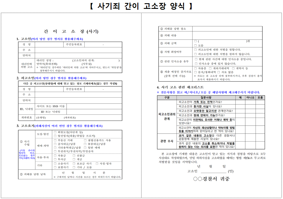 간이 고소장 양식은 전국 경찰관서 민원실 및 수사민원상담센터에서 활용할 수 있으며, 경찰청 누리집에서도 확인 가능하다.