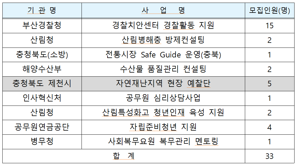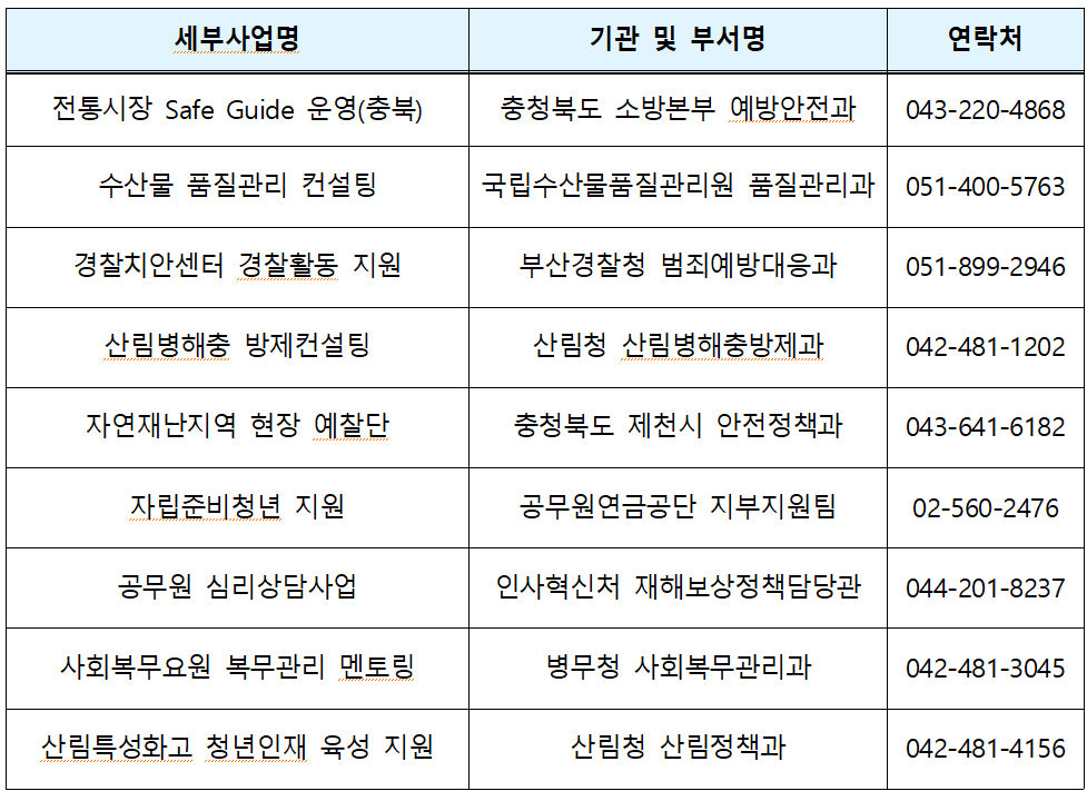퇴직공무원의 전문성과 경험을 활용하여 행정 사각지대를 해소하고 국민에게 더 나은 서비스를 제공하기 위해 추진하고 있는 「퇴직공무원 사회공헌사업」 신규참가자를 다음과 같이 공개 모집하오니 유능한 퇴직공무원들의 많은 응모를 바랍니다.