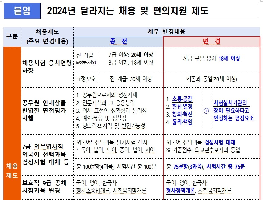 달라지는 채용시험 제도는 첫째, 5・7급 국가공무원 채용시험에 응시할 수 있는 연령 기준이 ‘20세 이상’에서 ‘18세 이상’으로 낮아진다. 다만 교정·보호 직렬의 응시연령 기준은 모든 직급에서 현행 20세 이상으로 그대로 유지된다.