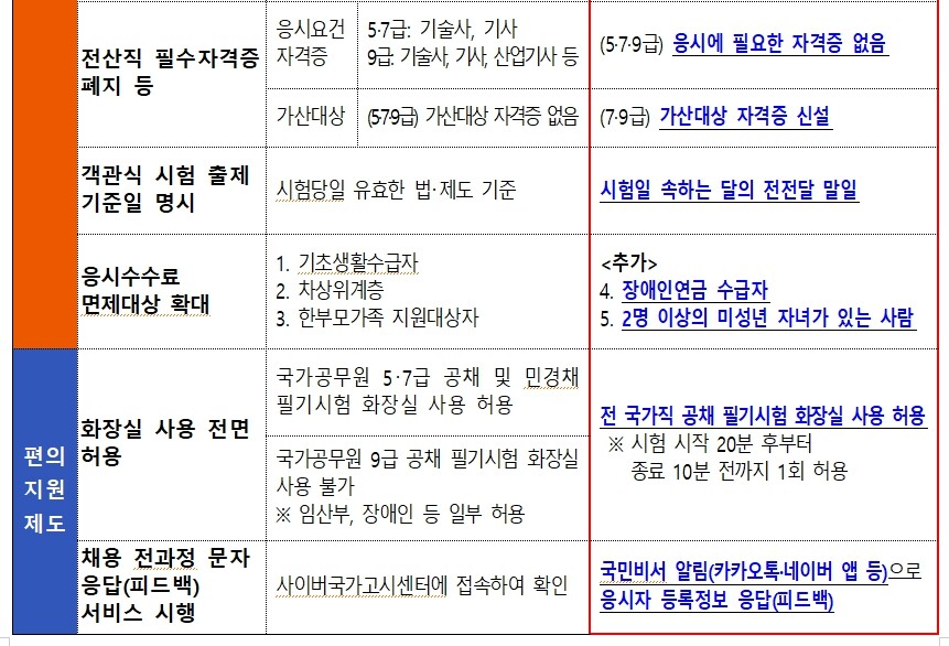 다섯째, 전산직 필수자격증이 전면 폐지되고, 경력경쟁채용 응시요건으로서의 자격증 기준은 현행대로 유지된다. 다만, 6급 이하 전산직렬 채용시험에서는 전산 직무 관련 자격증 소지 시 가산점을 받을 수 있다.