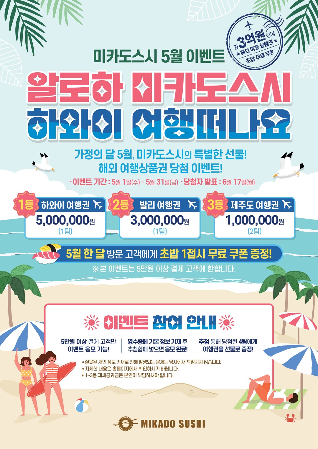이번 이벤트는 전국 미카도스시 가맹점에서 회전초밥 5만원 이상 식사 후 결제한 고객에 한해 식사 후 영수증을 응모 받아 추첨하는 방식으로 진행된다. 경품은 1등 500만원 상당의 하와이 여행상품권(1팀), 2등 300만원 상당의 발리 여행상품권(1팀), 3등 100만원 상당의 제주도 여행 상품권(2팀)으로 구성했다.