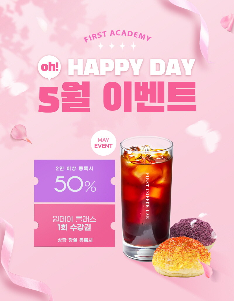 가정의 달을 맞이해서 퍼스트바리스타제과제빵학원은 5월 한 달 동안 2인 이상 함께 등록 시 수강료를 최대 50% 할인된 금액대로 수강할 수 있다.