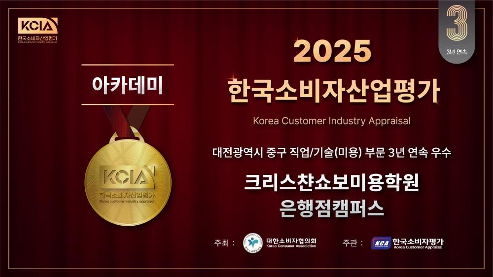 프랑스 50년 전통의 미용학원 크리스챤쇼보 대전은행점캠퍼스가 2025년 KCIA 한국소비자산업평가 ‘아카데미’에서 3년 연속 우수교육기관으로 선정되었다.