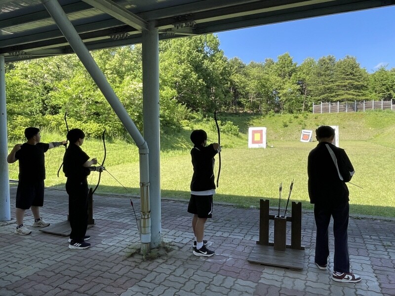 [이미지 설명 : 행복컬쳐캠프에 참여한 목천중학교 학생들이 국궁 활동에 참여하고 있다. <사진=국립중앙청소년수련원 제공>]