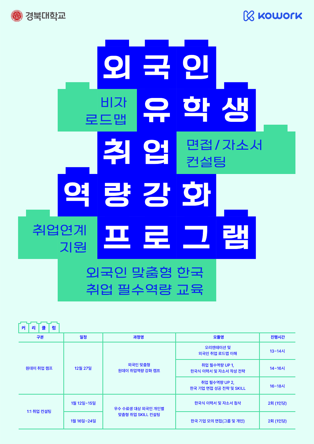 이번 프로그램은 크게 두 가지 과정으로 구성된다. 첫 번째 ‘외국인 맞춤형 원데이 취업 역량 강화캠프’는 12월 27일 하루 동안 진행되며 ▲외국인 유학생을 위한 취업 로드맵 이해, ▲한국형 이력서 및 자기소개서 작성법, ▲한국 기업 면접 성공 전략 및 실습을 포함한 3단계 교육으로 구성된다. 이론과 실습을 병행하여 참가자들이 실제 취업 준비 과정 에서 활용할 수 있는 실질적인 스킬을 습득할 수 있도록 돕는다.