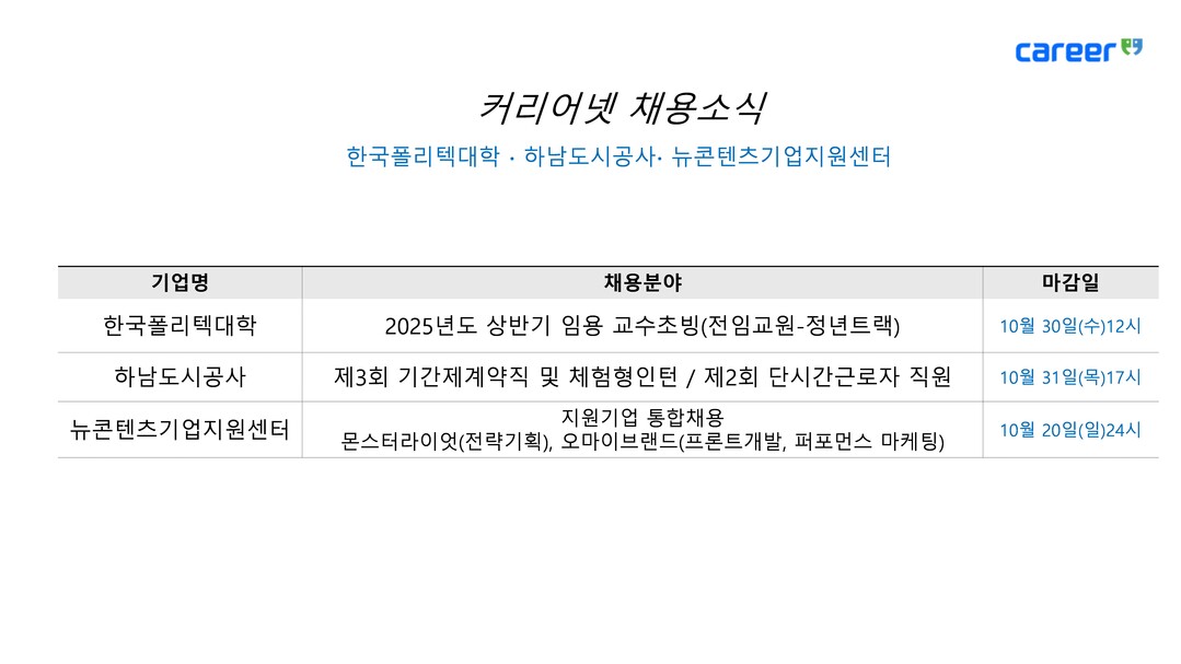 [피앤피뉴스=마성배 기자] 취업포털 커리어는 17일 한국폴리텍대학, 하남도시공사, 뉴콘텐츠기업지원센터의 채용 소식을 발표했다. 각 기관은 다양한 분야에서 인재를 모집하며, 구직자들에게 폭넓은 기회를 제공하고 있다.