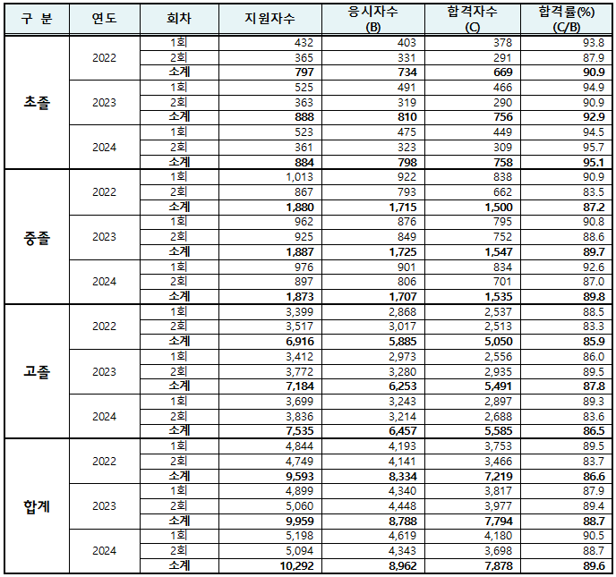 이번 시험에는 초졸 476명, 중졸 1,016명, 고졸 3,796명 등 총 5,288명이 지원해 높은 관심을 보였다. 특히 장애인 응시자는 48명, 재소자는 50명에 달했다.