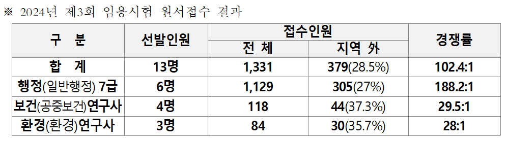 이번 원서접수 결과, 13명 선발에 총 1,331명이 지원했으며, 이 중 379명(28.5%)이 지역 외 응시자인 것으로 나타났다. 이는 지난해 동일 직렬 평균 경쟁률인 58.5대 1보다 1.7배 높은 수치다.