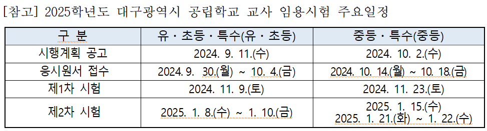 유치원·초등·특수(유치원·초등) 교사 임용시험의 시행계획은 9월 11일에 공고되며, 9월 30일부터 10월 4일까지 5일간 온라인 원서접수가 진행된다. 이후 11월 9일에 1차 시험이 치러질 예정이다.