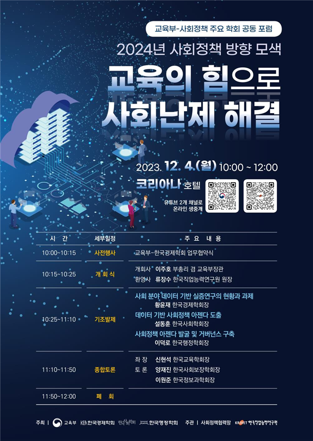 이주호 부총리 겸 교육부 장관은 개회사에서 “올해는 교육개혁의 원년으로 국가책임 교육‧돌봄, 교육 회복과 대전환, 대학 개혁이라는 3대 개혁 기반 마련에 집중했다면, 내년에는 가시적 성과를 창출하면서 데이터를 추진 동력으로 과학적인 인재·사회정책을 밀도 있게 추진해 나갈 것”이라며, “저출산, 지역소멸 등 우리 사회의 난제 해결을 위해 정부-학계-연구계를 아우르는 한 차원 높은 사회정책 협력체계를 구축하겠다”라고 밝혔다.