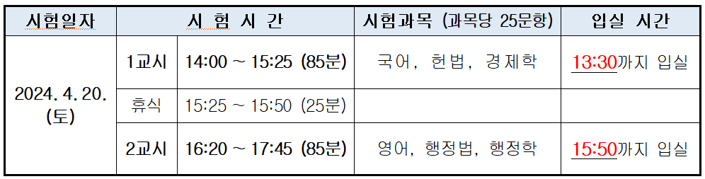 1교시는 오후 2시부터 3시 25분까지 85분간 국어·헌법·경제학 3과목(과목당 25문항)을, 휴식 시간(25분) 후 2교시는 오후 4시 20분부터 5시 45분까지 영어·행정법·행정학을 치른다.