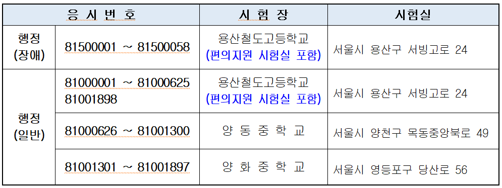 올해 국회직 8급 행정(일반)은 ▲용산철도고등학교 ▲양동중학교 ▲양화중학교 등 서울 시내 3개 시험장에서 치러지며, 행정(장애)는 용산철도고등학교에서 시행된다.