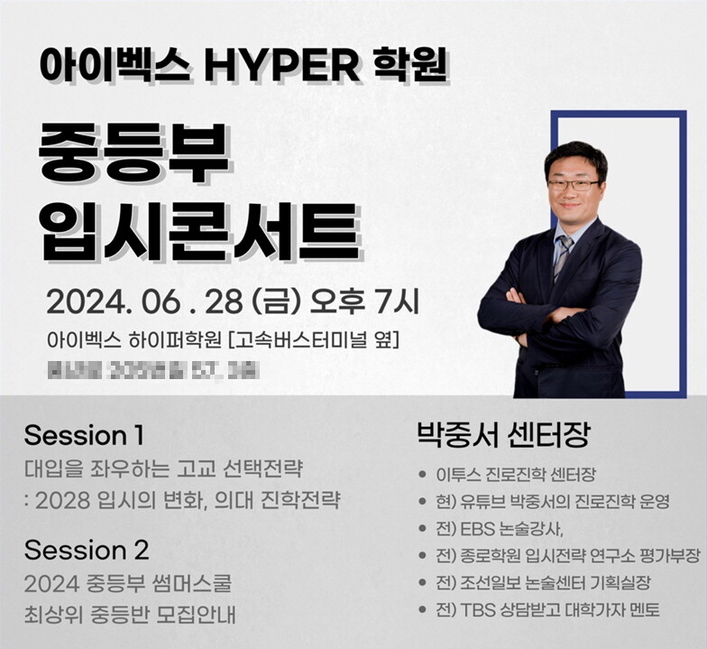 한편, ‘중등부 입시콘서트’는 박중서 이투스에듀 진로진학센터장이 이끈다. 박중서 이투스에듀 진로진학센터장은 전 EBS 논술 강사, 전 종로학원 입시전략 연구소 평가부장, 전 조선일보 논술센터 기획실장, 전 TBS 상담받고 대학가자 멘토로 활동한 바 있다.