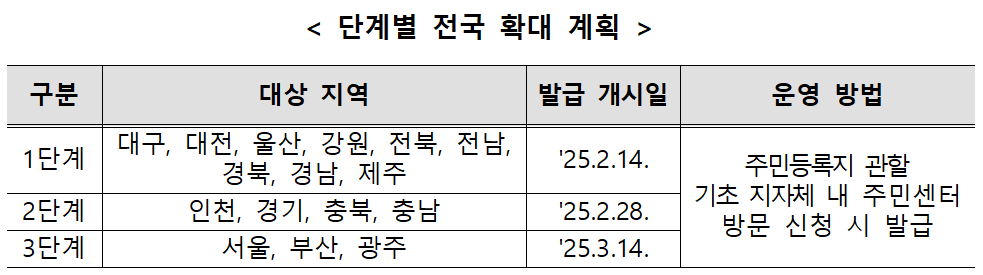 1단계(2월 14일)에서는 기존 시범 운영 지역을 포함해 대구, 대전, 울산, 강원, 전남·전북, 경남·북, 제주 등 9개 광역 지자체에서 추가 발급을 시작한다. 2단계(2월 28일)에서는 인천광역시, 경기도, 충청북도, 충청남도로 확대되며, 3단계(3월 14일)에서는 서울, 부산, 광주 등 대도시에서도 발급이 가능해진다. 최종적으로 3월 28일부터는 주민등록지와 관계없이 전국 모든 주민센터에서 모바일 주민등록증을 신청하고 발급받을 수 있다.