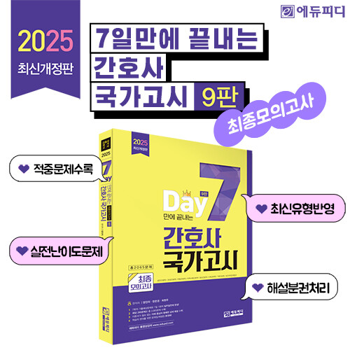 에듀피디가 새롭게 선보이는 ‘7일 만에 끝내는 간호사국가고시 2065제’ 개정 9판은 최신 시험의 빅데이터 분석을 통해 출제가 유력한 2065문항을 담아낸 교재로, 실제 시험과 동일한 문항 수, 문제유형, 난이도를 반영해 수험생이 실전과 같은 환경에서 자신의 실력을 가늠할 수 있도록 구성된 총 7회분의 기출 예상 모의고사 문제집이다.