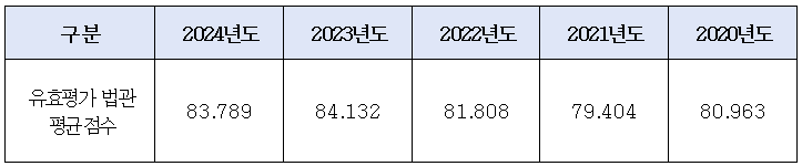 평가 결과 법관들의 평균 점수는 83.789점(100점 만점)으로 나타났다. 이는 지난해 평균 점수인 84.132점과 큰 차이가 없었으며, 여전히 80점 이상의 평가를 유지하고 있다. 평가 점수 분포는 90~85점대(28.49%)와 85~80점대(26.80%)에서 가장 많았다.