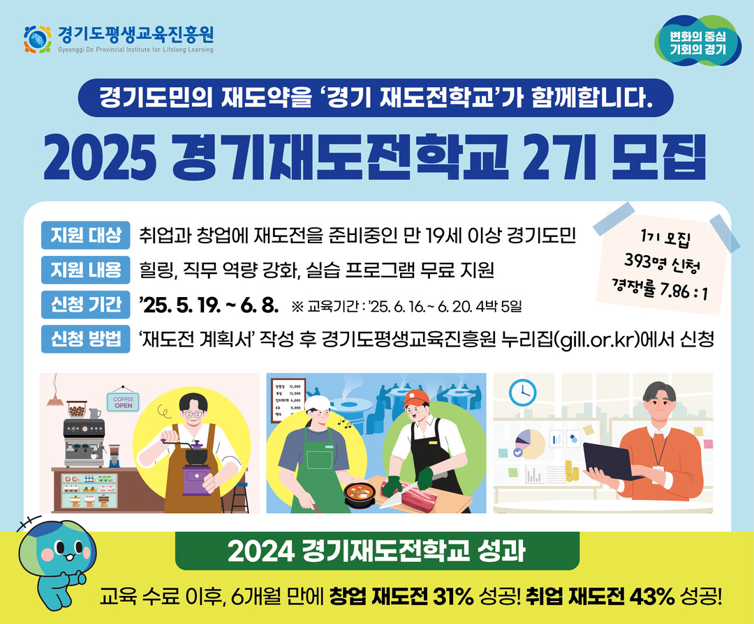 신청은 경기도평생교육진흥원 누리집(gill.or.kr)에서 ‘재도전 계획서’를 작성·제출하면 된다.