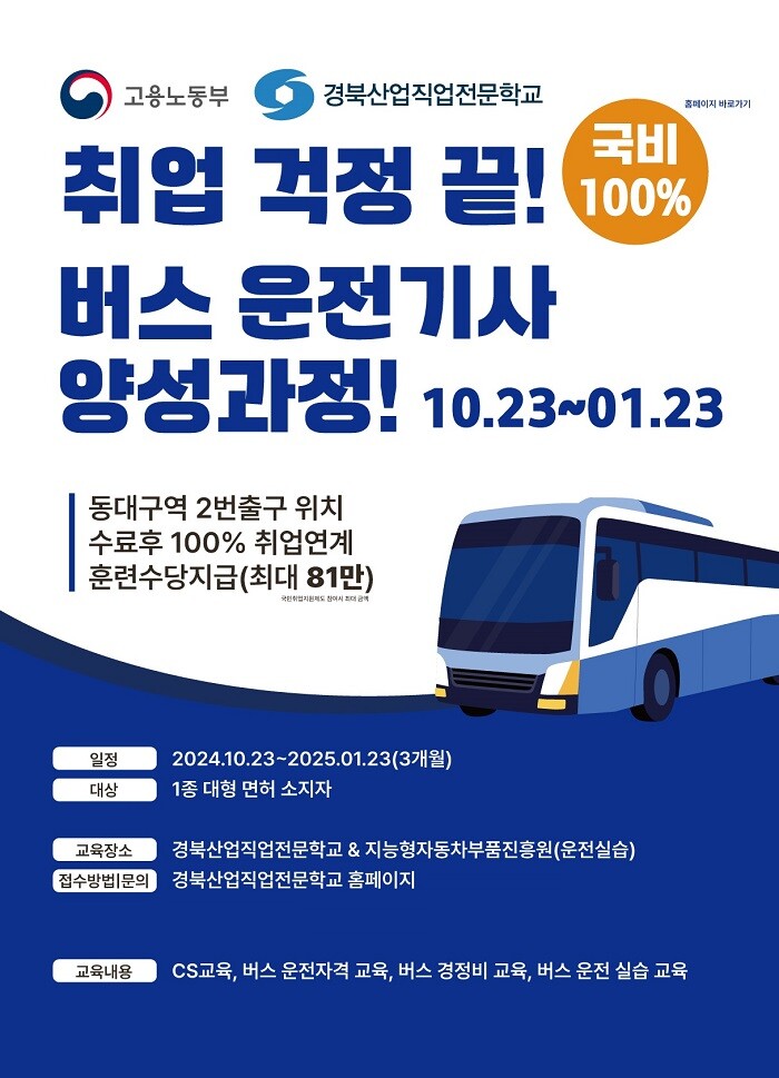 경북산업직업전문학교 관계자는 “이번 과정을 통해 대구·경북 지역의 교통산업 발전에 이바지하고, 고령화로 인한 버스 운전 인력 부족 문제 해결에 중요한 역할을 하길 기대한다”며 “버스 운전 직종에 관심 있는 지원자들은 빠른 신청을 권한다”고 밝혔다.
