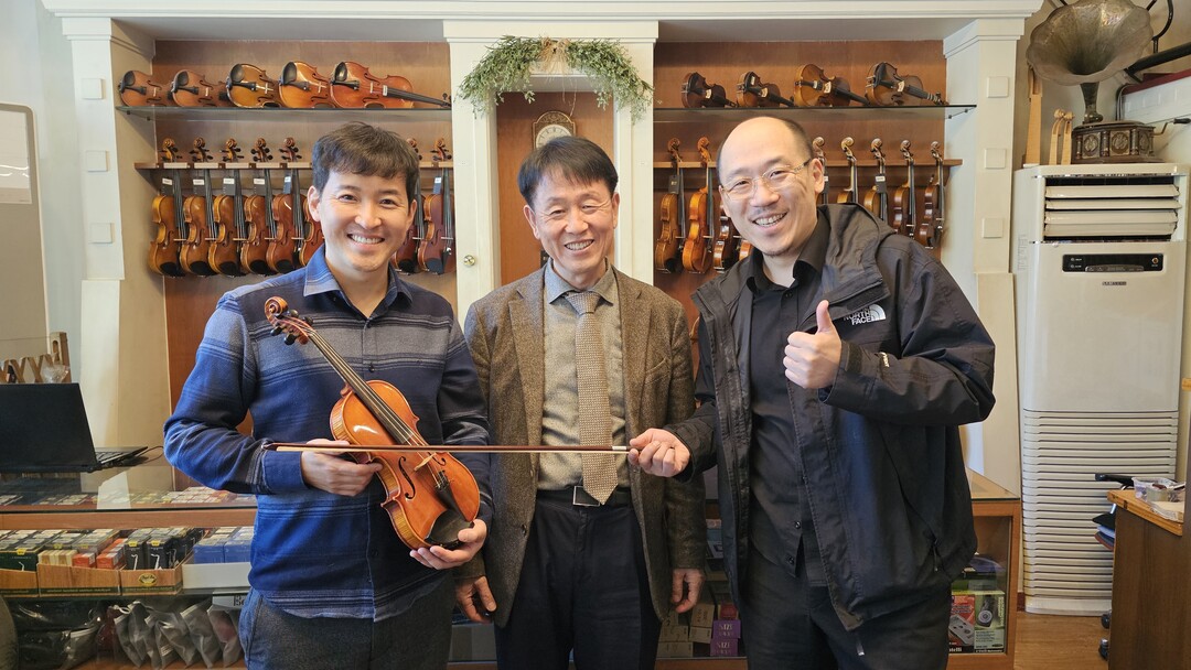 세계악기 김용기 대표(가운데)가 국제 혁신영재사관학교에 악기를 지원한 후 오두환 이사장(오른쪽), 최병호 교감(왼쪽)과 기념 촬영을 하고 있다.