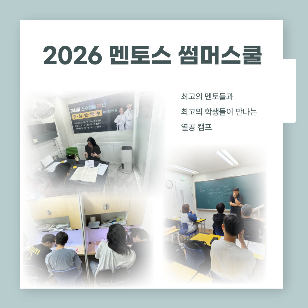 대치동 멘토스학원은 소수정예 재수학원의 원조학원으로 25년 된 강남 대치동에서 메가스터디 다음으로 오래된 학원이다. 2027년 수능대비 정규반 개강은 시작되었고 약간 명 추가 모집중이다.