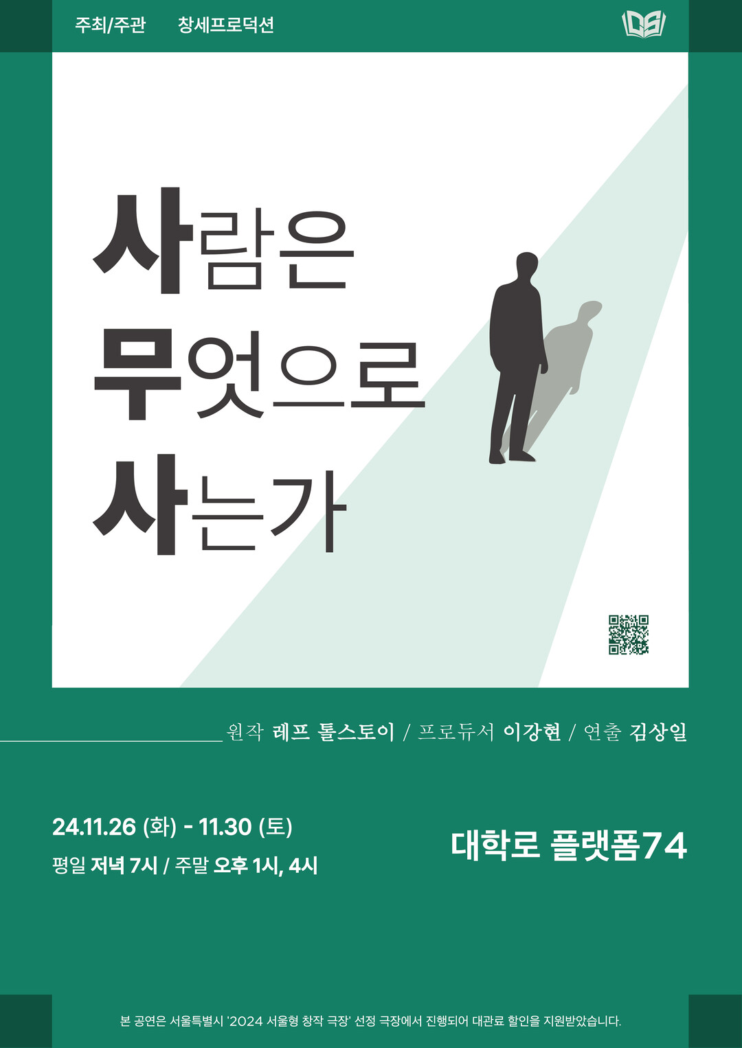 창세프로덕션은 오는 11월 26일부터 30일까지 서울 대학로 플랫폼74에서 레프 톨스토이의 작품을 원작으로 한 연극 '사람은 무엇으로 사는가'를 무대에 올릴 예정이라고 밝혔다.
