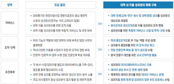 KEDI는 이를 위해 대학이 성과관리 전담조직의 위상 강화, 규모 확대, 전문 인력 확보 등에 나서야 하며, 이러한 기반 위에서야 내부 경영 혁신이 가능하다고 제안했다.