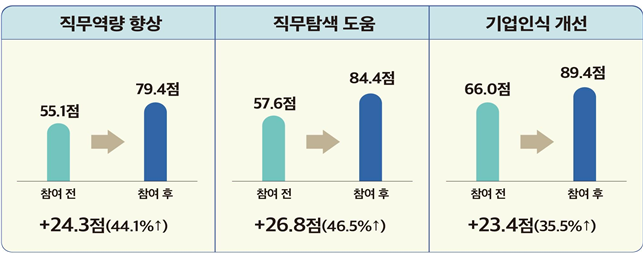 청년들은 이 프로그램을 통해 직무 역량을 키우고 자신의 직업 경로를 탐색하는 데 큰 도움을 받고 있다. ‘엔터비즈니스 마스터 클래스’에서 아티스트와 함께 콘텐츠 제작을 경험한 한 청년은 이를 바탕으로 취업에 성공했다. 또, 기계공학과 출신의 ㄴ청년은 냉동공조 시스템 설계 실무를 경험한 후 적성을 확인하고 해당 기업에 취업했으며, ㄷ청년은 GS인증 관련 경험을 쌓은 후 직무 전문성을 키우기 위해 국비 지원 훈련에 참여 중이다.