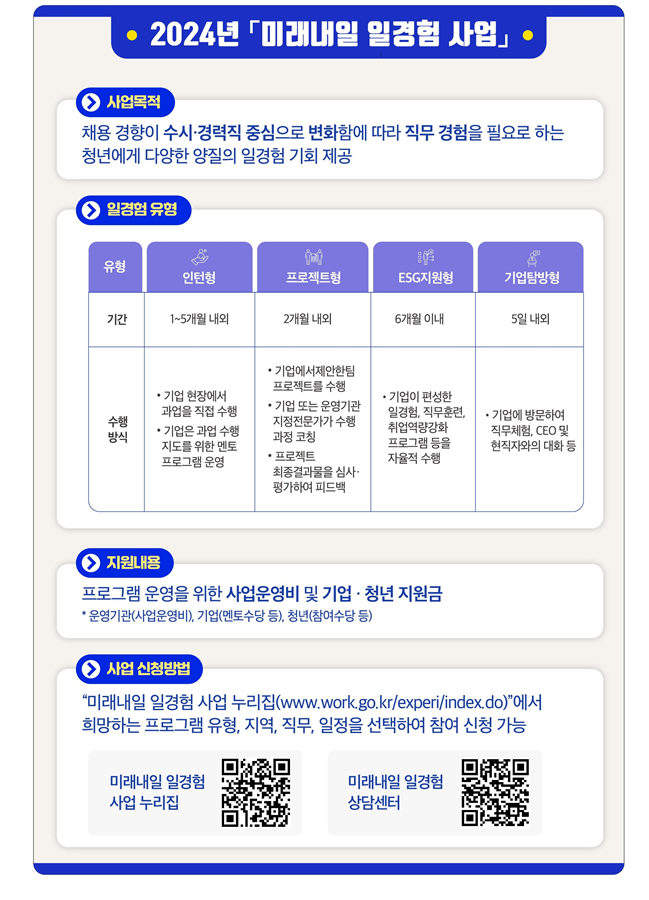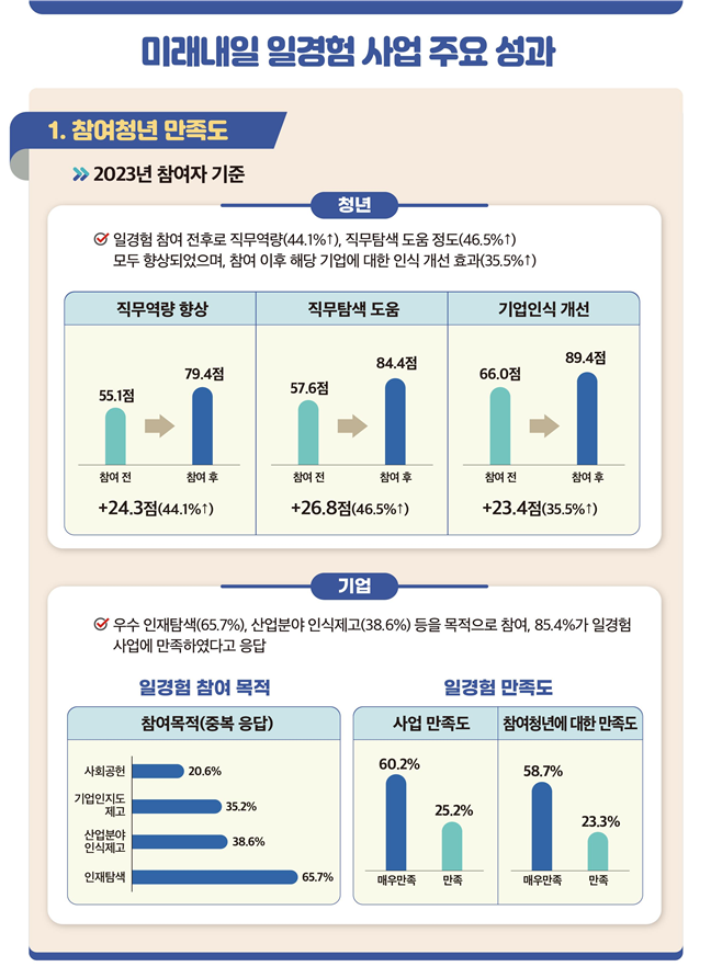올해 신규 채용 실태조사에 따르면, 기업의 74.6%가 신규 채용 시 가장 중요한 평가 요소로 ‘직무 관련 업무 경험’을 꼽았다. 이처럼 직무 경험이 점점 더 중요해지는 상황에서 ‘미래내일 일경험사업’은 청년들이 기업 현장에서 실무를 경험하고 이를 통해 직무 역량을 높일 수 있도록 설계되었다.