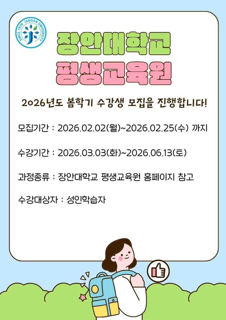 장안대학교 평생교육원(원장 윤경아)이 경기도 남부권 지역주민의 자기계발과 인생 이모작 설계를 돕기 위해 '2026년 봄학기 평생교육과정' 수강생을 모집한다.