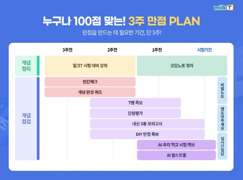 밀크T중학 관계자는 “최고의 강사진이 진행하는 과목별 강좌와 실전에 강한 시험 대비 서비스를 함께 이용하면 효과적”이라면서 “밀크T에서 제시하는 3주 완성 플랜으로 시험에서 고득점을 받을 수 있길 바란다.”고 전했다.